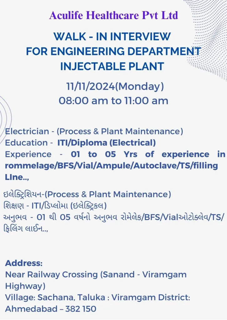 - Experience: 01 to 05 Yrs of experience in Process and plant maintenance like rommelage/BFS/Vial /Ampule/Autoclave/TS/filling Line/HVAC/Chiller /EMS/BMS & Water System etc.,