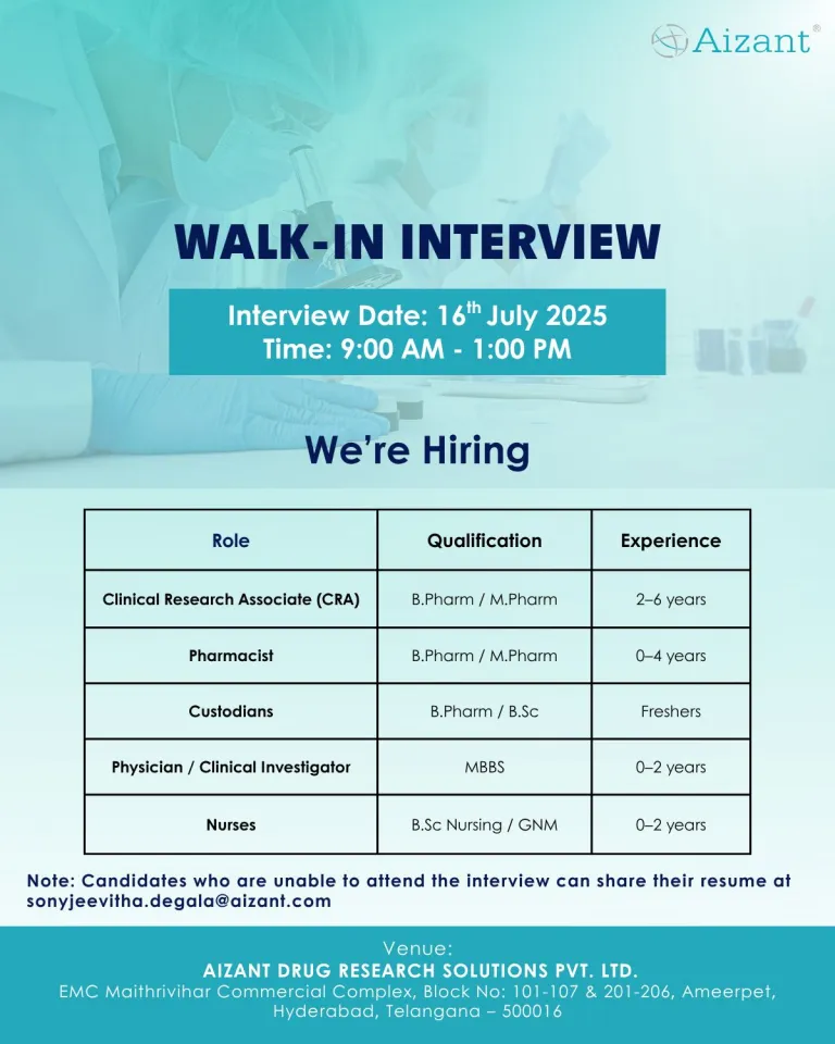 Venue: Aizant Drug Research Solutions Pvt. Ltd., EMC Maithrivihar Commercial Complex, Block No: 101-107 & 201-206, Ameerpet, Hyderabad, Telangana – 500016