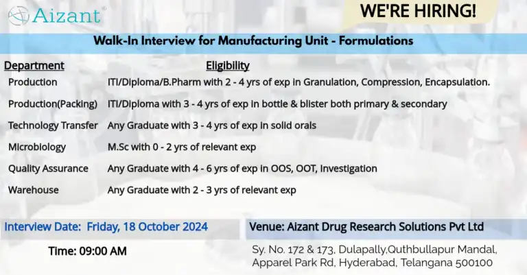 • Venue: Aizant Drug Research Solutions Pvt Ltd Sy. No. 172 & 173. Dulapally, Quthbullapur Mandal, Apparel Park Rd, Hyderabad, Telangana 500100