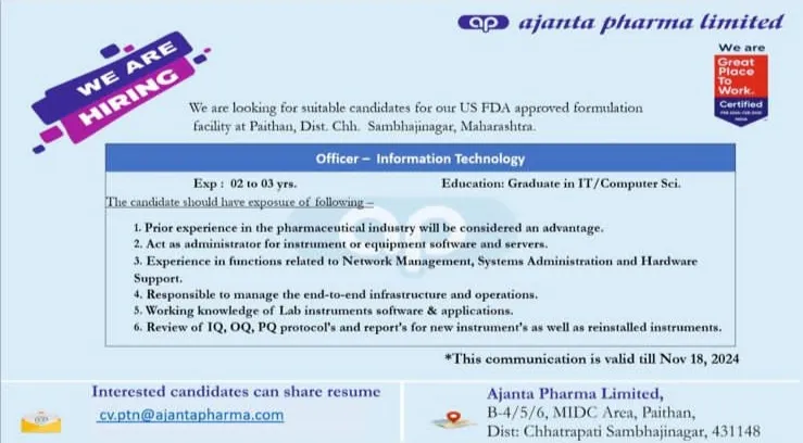 Location : Ajanta Pharma Limited, B-4/5/6, MIDC Area, Paithan, Dist: Chhatrapati Sambhajinagar, 431148