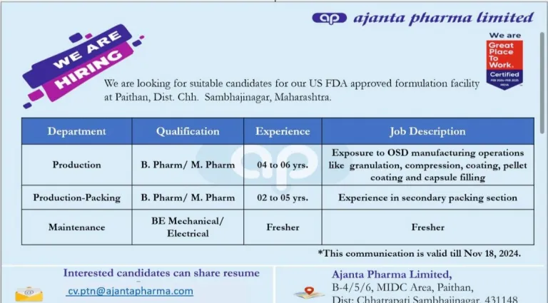 We are looking for suitable candidates for our US FDA approved formulation facility at Paithan, Dist. Chh. Sambhajinagar, Maharashtra.