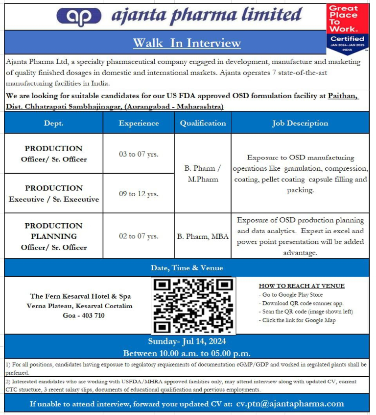 Send Resume TO HR mail cv.ptn@ajantapharma.com