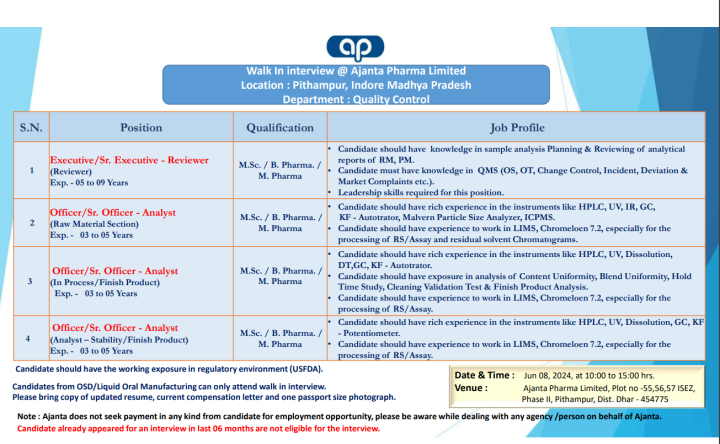 Candidates from OSD/Liquid Oral Manufacturing can only attend walk in interview.