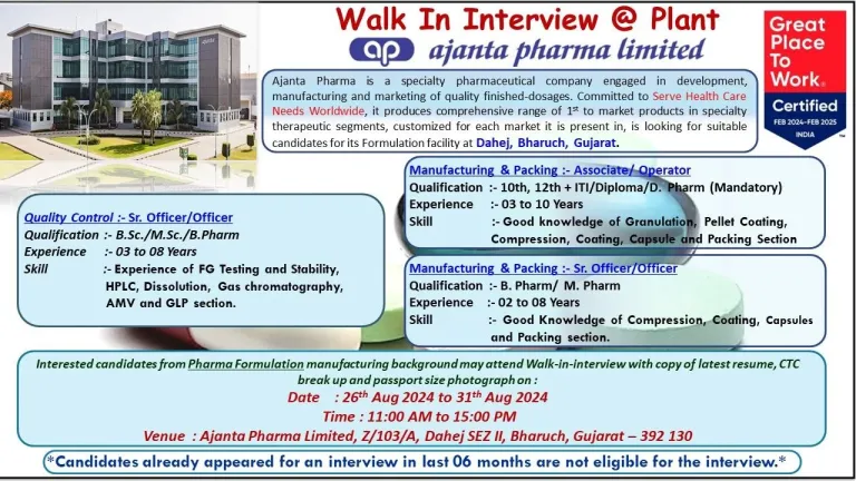 Ajanta Pharma is a specialty pharmaceutical company engaged in development manufacturing and marketing of quality finished-dosages. Committed to Serve Health Care Needs Worldwide, it produces comprehensive range of 1st to market products in specialty therapeutic segments, customized for each market it is present in, is looking for suitable candidates for its Formulation facility at Dahej, Bharuch, Gujarat