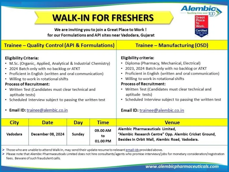 - Candidates who are unable to attend interview, may share their updated resume on trainee@alembic.co.in.
