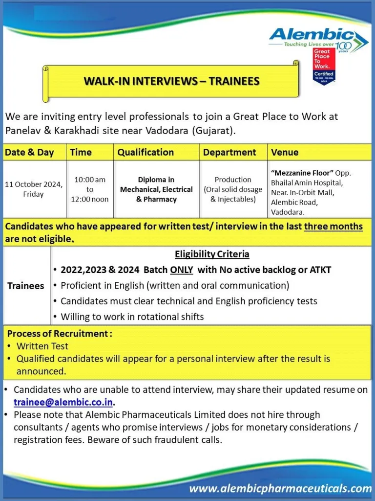 - Candidates who are unable to attend interview, may share their updated resume on trainee@alembic.co.in.