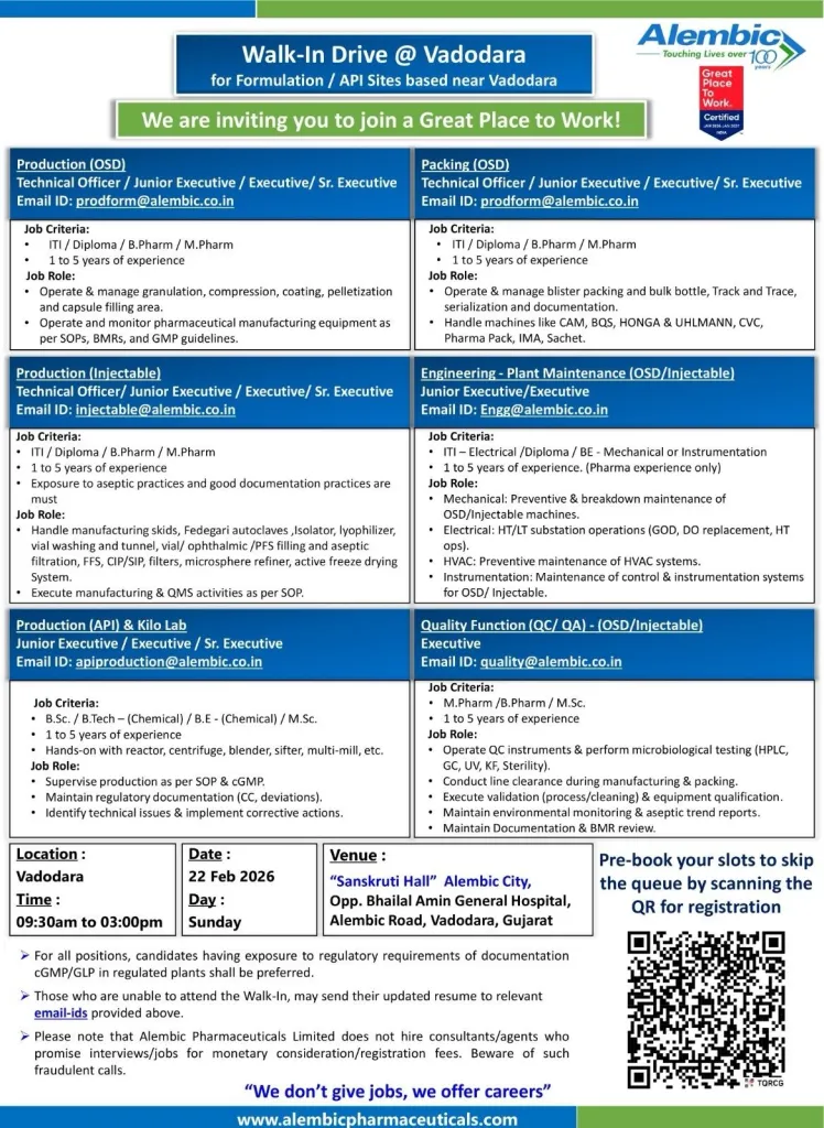 - Qualification: B.Sc / M.Sc./ B.Pharm / B.E, B.Tech / M.Pharm / D.Pharm / ITI / Diploma