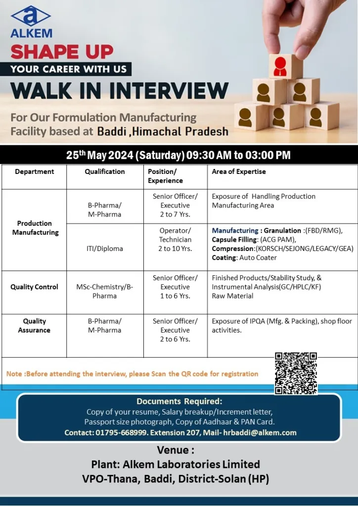 Alkem Laboratories Limited is an Indian multinational pharmaceutical company headquartered in Mumbai, Maharashtra, India that manufactures and sells pharmaceutical generics, formulations and nutraceuticals in India and globally. Alkem Laboratories Ltd Conducting Walk-In Interview for Our Formulation Manufacturing Facility based at Baddi.