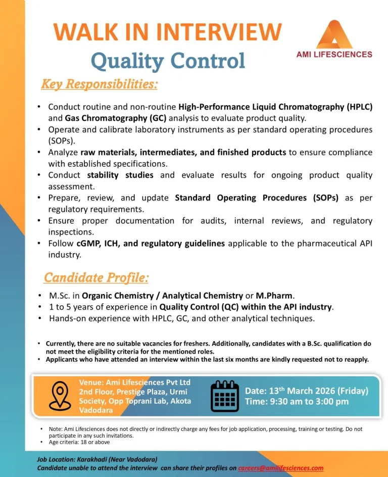 - Skills Required: HPLC, GC, Stability Studies, Raw Material & Finished Product Analysis, cGMP & ICH guidelines