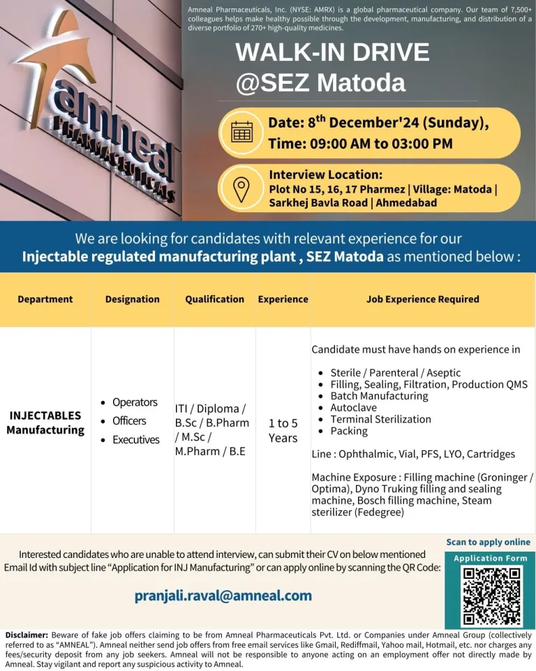 Interested candidates can register by submitting their details through the link below: “https://lnkd.in/ds32VmXp” or can share their CV at pranjali.raval@amneal.com