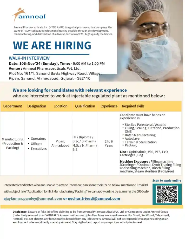 Interested candidates can register by submitting their details by scanning the given QR code in the job advertisement or can share their CV at ajaykumar.pandey@amneal.com with subject line “Application for INJ Manufacturing”