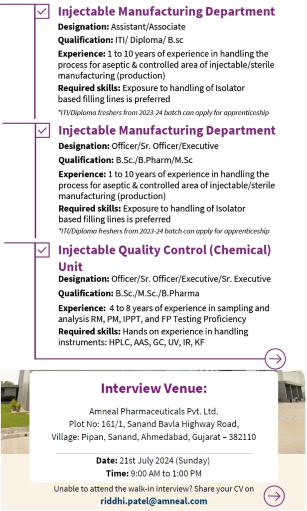 Unable to attend the walk-in interview? Share your CV on riddhi.patel@amneal.com