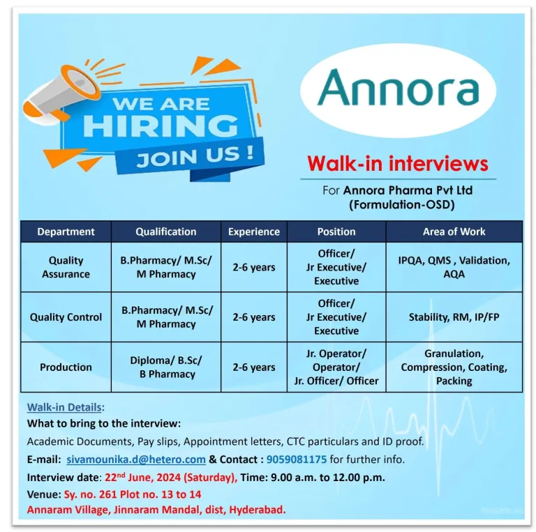 - Venue: Annora Pharma, Sy. No: 261, Plot No: 13-14, Annaram Village, Jinnaram Mandal, dist, Hyderabad, Telangana