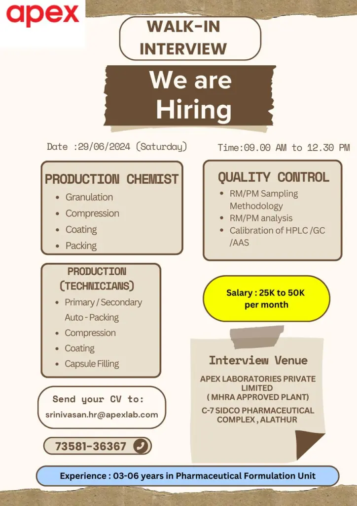 - Interview Location : apex laboratories private limited (MHRA Facility), C-7, SIDCO Pharmaceutical Complex, Alathur, Chengalpattu District, Tamil Nadu- 603 110.