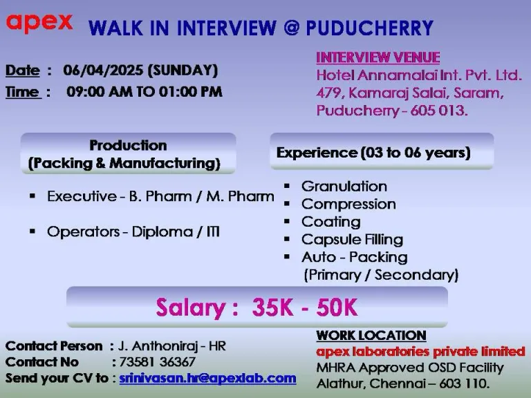 Work Location : Apex Laboratories Private Limited (MHRA Facility), C-7, SIDCO Pharmaceutical Complex, Alathur, Chengalpattu District, Tamil Nadu- 603 110.