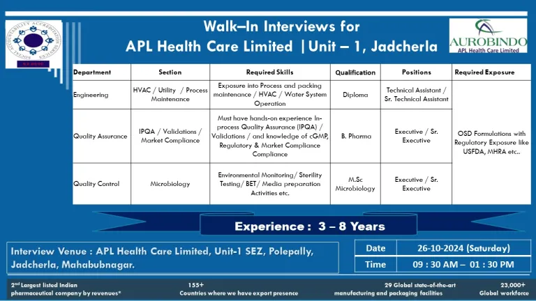 - Job Location: APL Health Care Limited, Unit-1, SEZ, Polepally, Jadcherla, Mahabubnagar