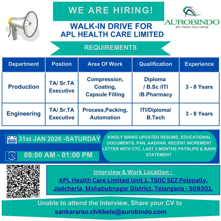 Share your CV to: sankararao.chitikela@aurobindo.com