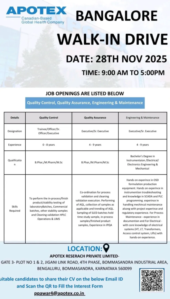 - Suitable candidates can also share their CV at ppawar4@apotex.co.in