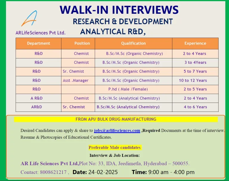 - Interview & Job Location: AR Life Sciences Pvt. Ltd, Plot No: 33, IDA, Jeedimetla, Hyderabad – 55