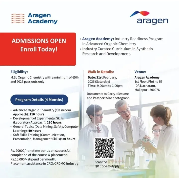 Aragen Life Sciences, through its training arm Aragen Academy, offers industry-focused programs designed to prepare chemistry graduates for careers in CRO and CRDMO research environments. The academy delivers hands-on laboratory training, advanced organic synthesis exposure, and professional skill development aligned with pharmaceutical R&D industry requirements.