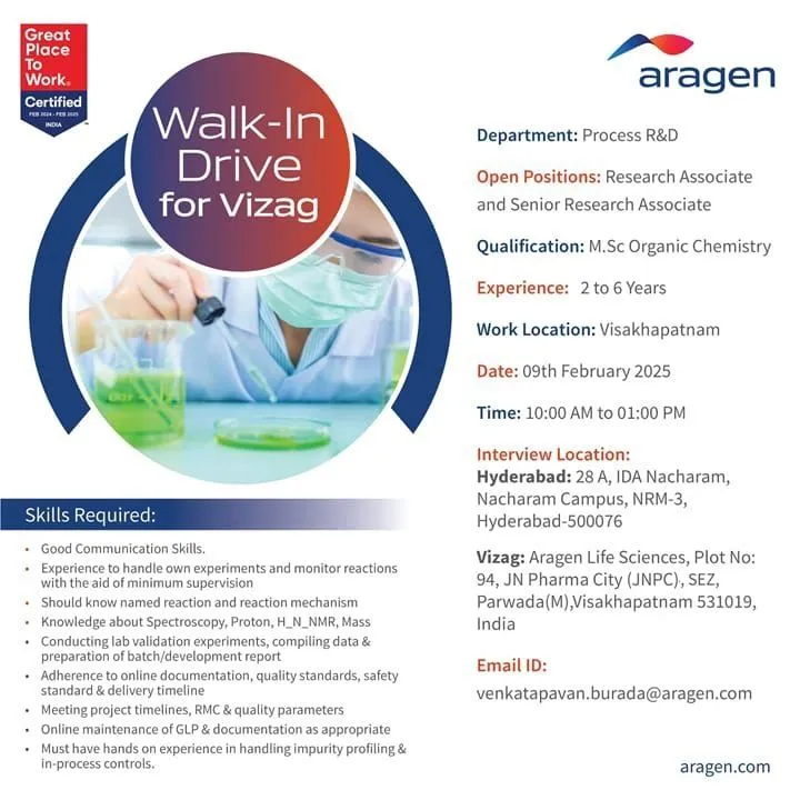 - Visakhapatnam: Aragen Life Sciences, SEZ unit, JNPC Pharma, Parawada, Visakhapatnam.
