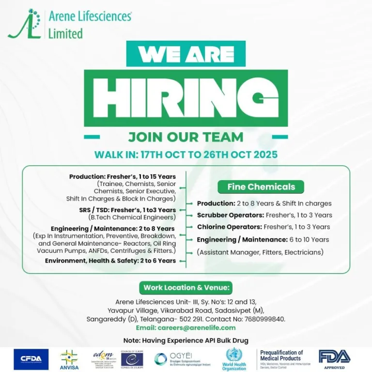 Venue:Arene Lifesciences Unit – III, Sy. No’s: 12 and 13,Yavapur Village, Vikarabad Road, Sadasivpet (M),Sangareddy (D), Telangana – 502291