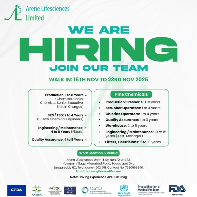 - Production: 1–8 years (Chemists, Sr. Chemists, Sr. Executive, Shift In-Charges)