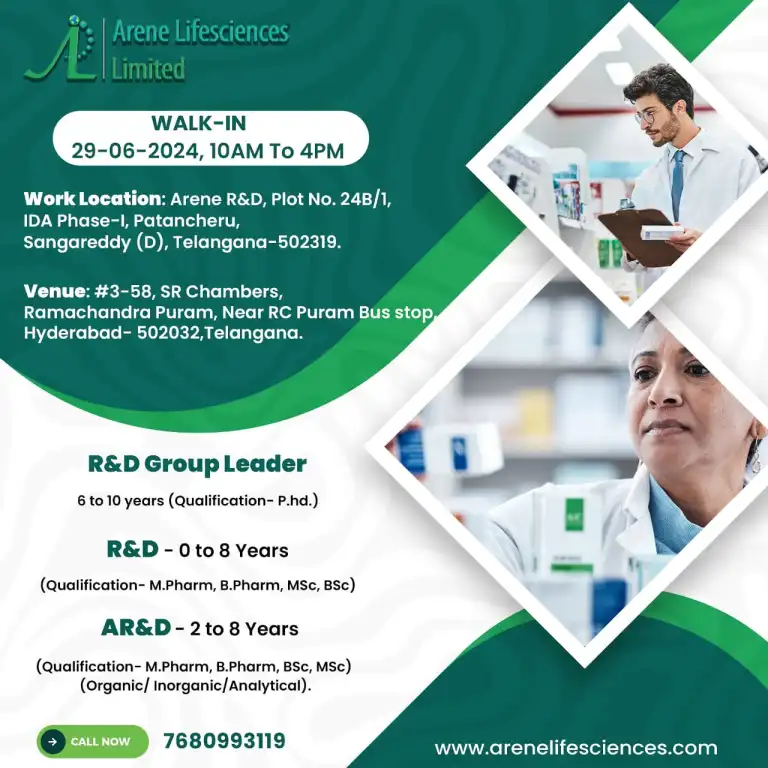 - Job Location:Arene R&D, Plot No. 24B/1,IDA Phase-I, Patancheru,Sangareddy (D), Telangana-502319.