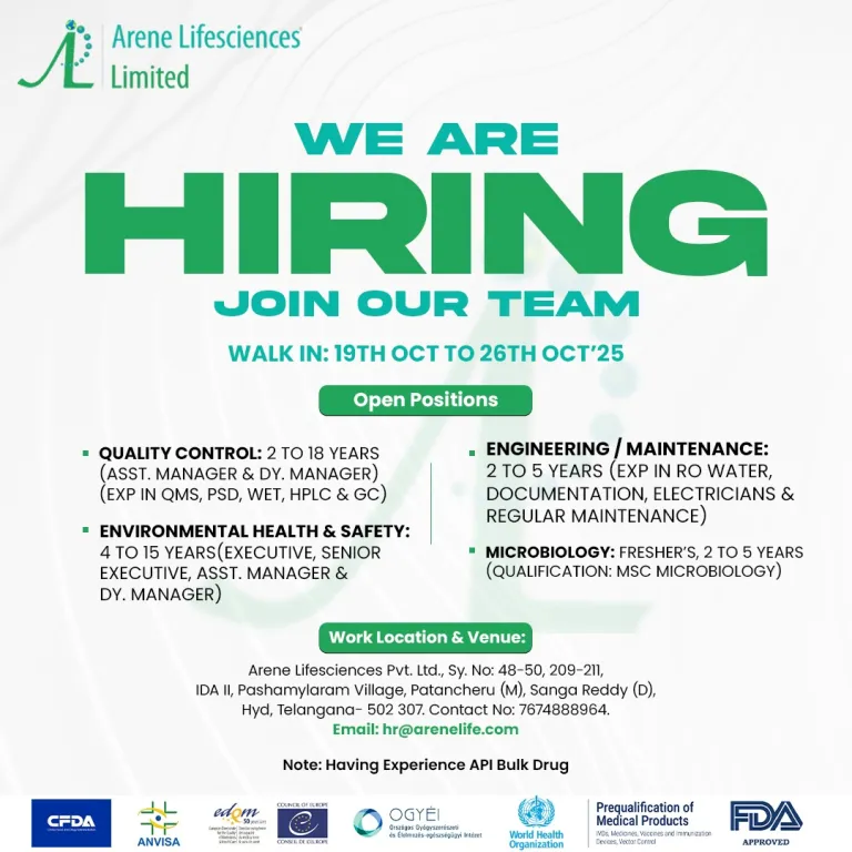 - Venue: Arene Lifesciences Pvt. Ltd., IDA II, Pashamylaram Village, Patancheru (M), Sangareddy (D), Telangana – 502 307