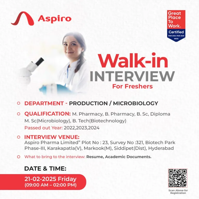 - INTERVIEW VENUE: Aspiro Pharma Limited” Plot No: 23, Survey No :321, Biotech Park Phase-III, Karakapatla (V), Markook(M), Siddipet(Dist), Hyderabad