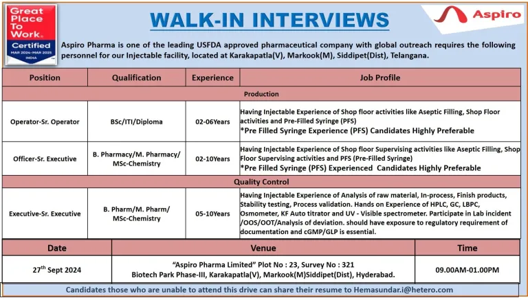 Note: Candidates those who are unable to attend this drive can share their resume to hemasundar.i@hetero.com