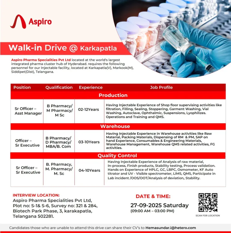 Aspiro Pharma Limited is one of the leading USFDA approved pharmaceutical company with global outreach requires the following personnel for our Injectable facility, located at Karkapatla(V), Markook(M), Siddipet(Dist), Hyderabad, Telangana.