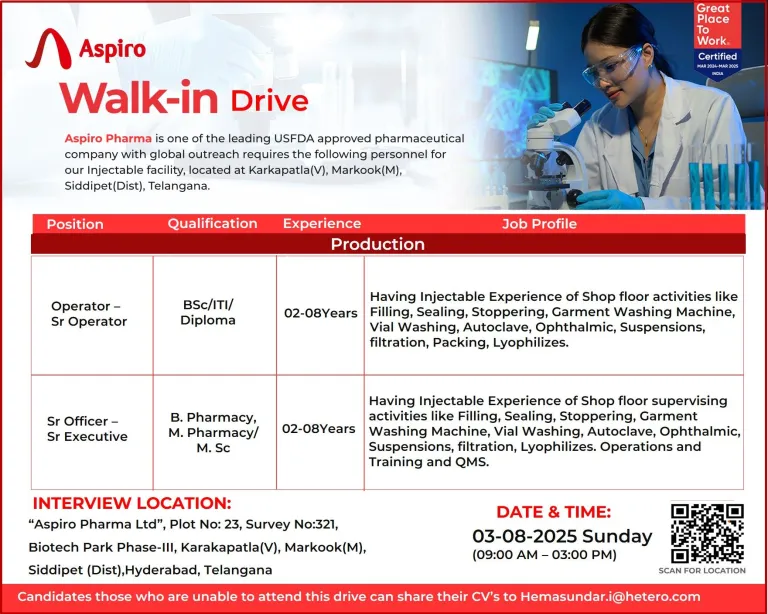 Aspiro Pharma is one of the leading USFDA approved pharmaceutical company with global outreach requires the following personnel for our Injectable facility, located at Karkapatla (V), Markook(M), Siddipet(Dist), Telangana.
