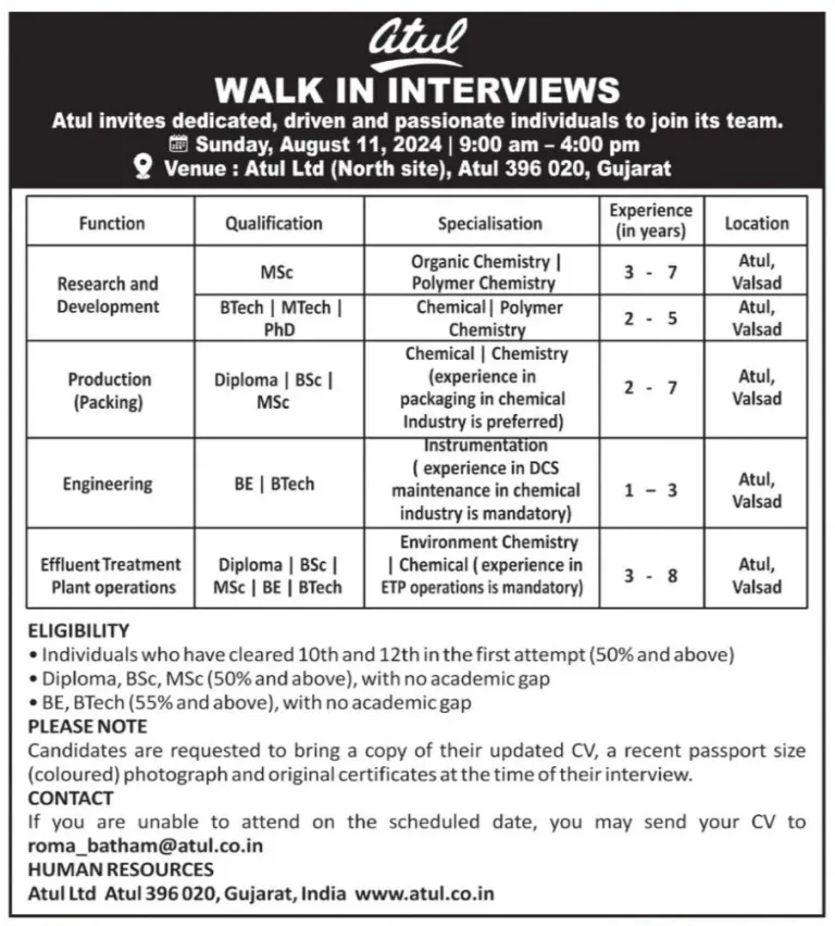 - Applicants who are unable to attend interview can mail your resumes to roma_batham@atul.co.in