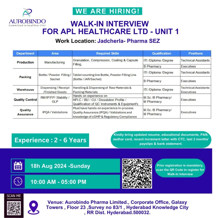 - Job Location: Aurobindo Pharma, Unit-VII, Jadcherla