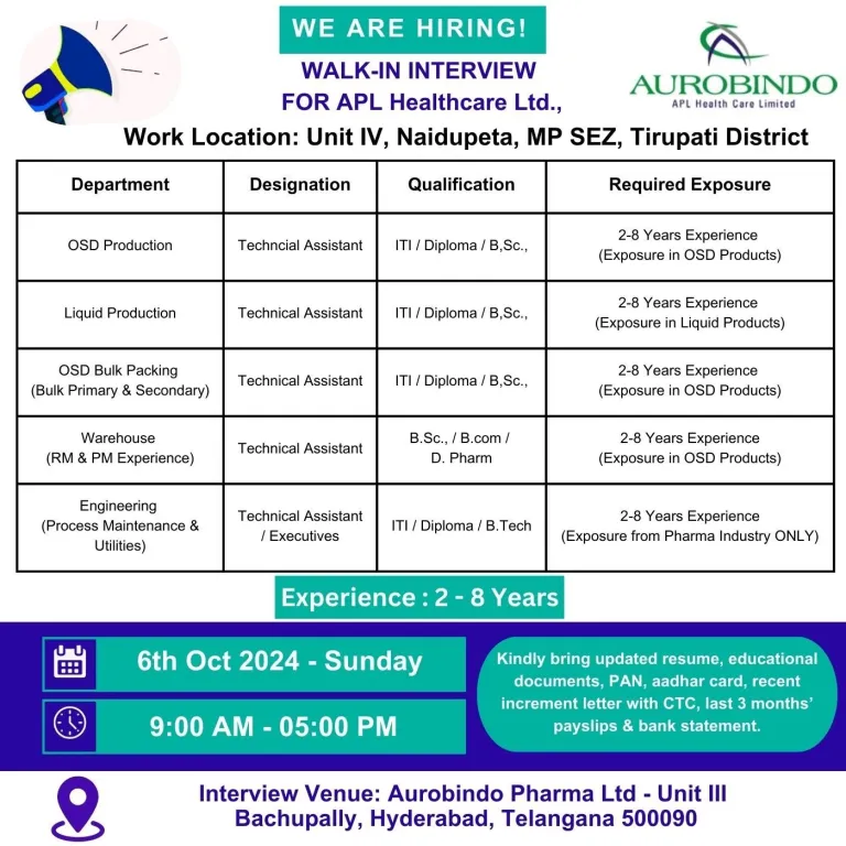 - Venue:Aurobindo Pharma Limited, Unit-3, Bachupally,Hyderabad, Telangana – 500 049.
