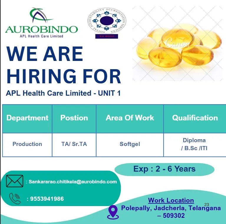 Interested candidates can reach out at: Sankararao.chitikela@aurobindo.com