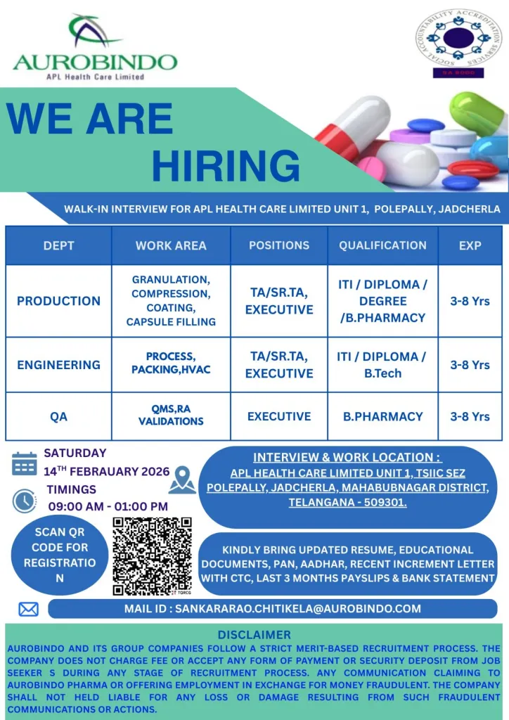 Venue : APL HEALTH CARE LIMITED UNIT 1, TSIIC SEZ POLEPALLY, JADCHERLA, MAHABUBNAGAR DISTRICT,  TELANGANA-509301.