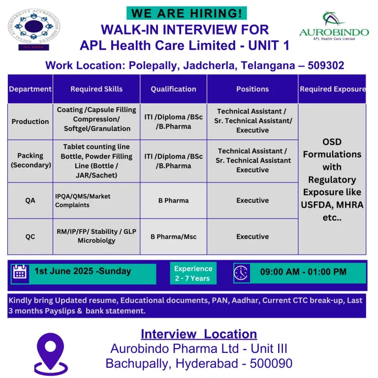 - Interview Location: Aurobindo Pharma Ltd – Unit III, Bachupally, Hyderabad
