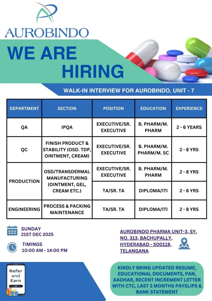 - Venue: Aurobindo Pharma Unit-3, Bachupally, Hyderabad