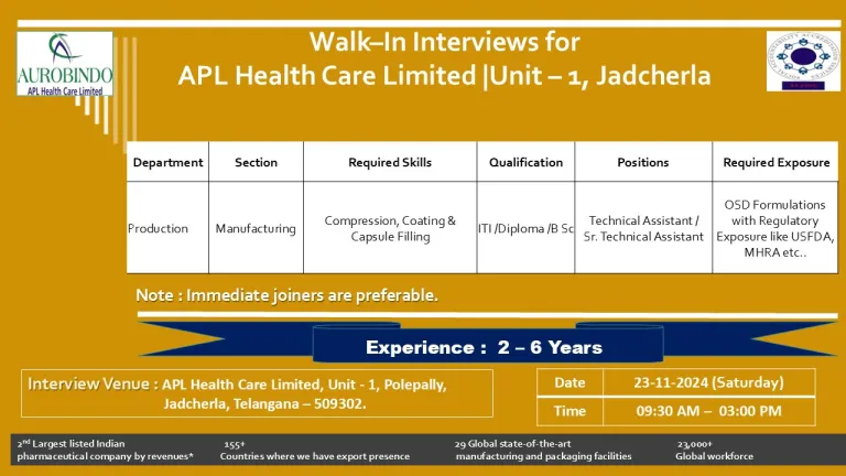 - Job Location: APL Health Care Limited, Unit-1, SEZ, Polepally, Jadcherla, Mahabubnagar