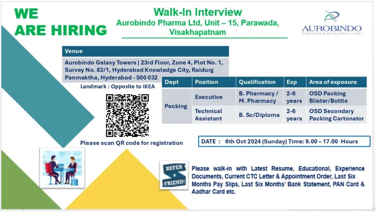 - Job Location: Aurobindo Pharma Limited, Unit-15, Parawada, Visakhapatnam