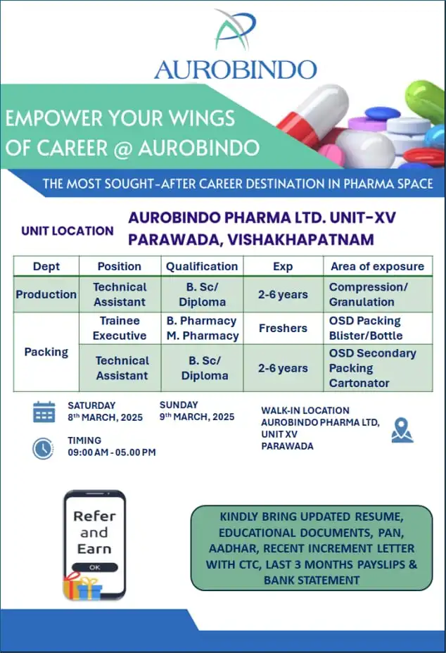 • Venue: AUROBINDO PHARMA LTD, UNIT XV, PARAWADA, VISAKHAPATNAM, A.P