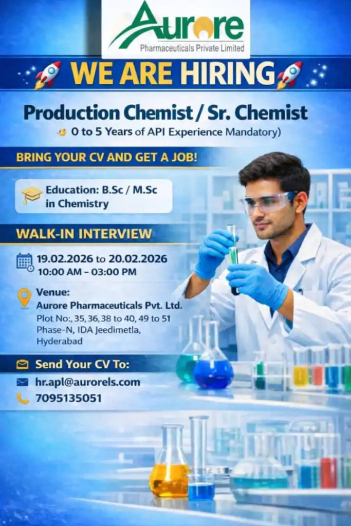 • B.Sc / M.Sc (Chemistry streams preferred for Production)