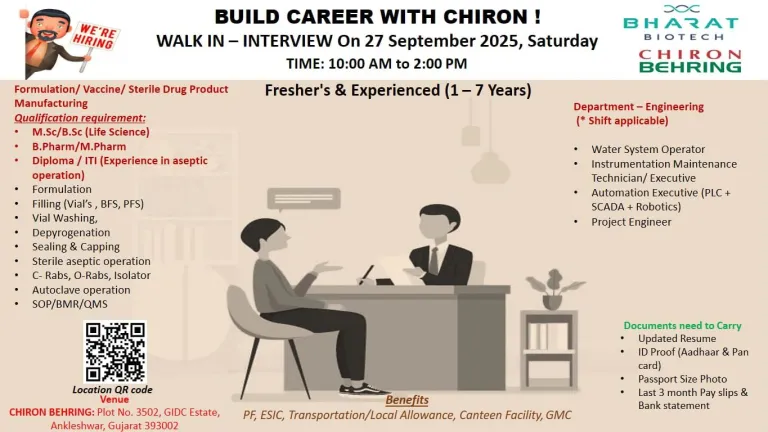Bharat Biotech | Chiron Behring is hiring passionate and skilled professionals for Formulation, Vaccine & Sterile Drug Product Manufacturing and Engineering Departments.