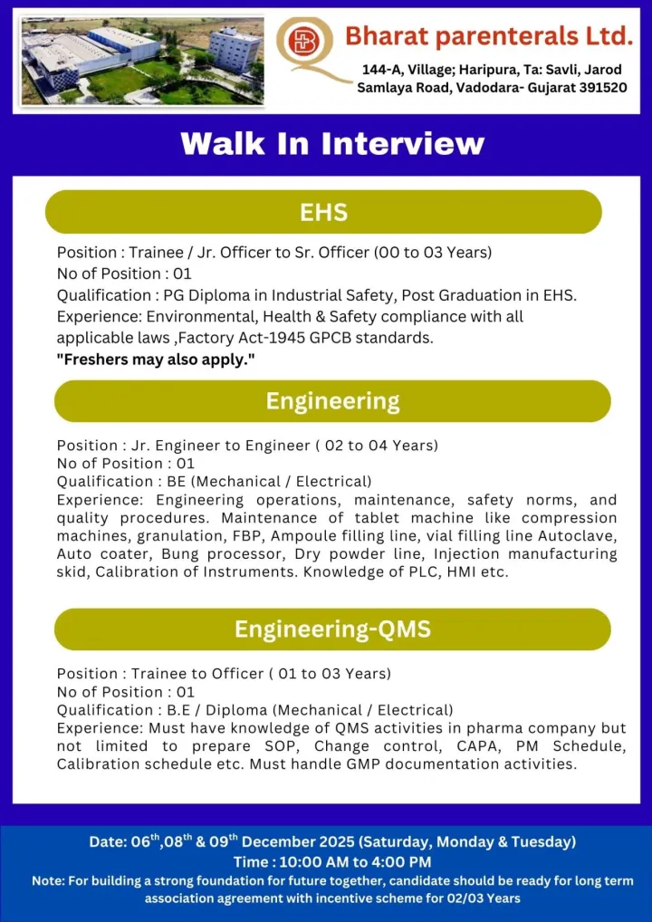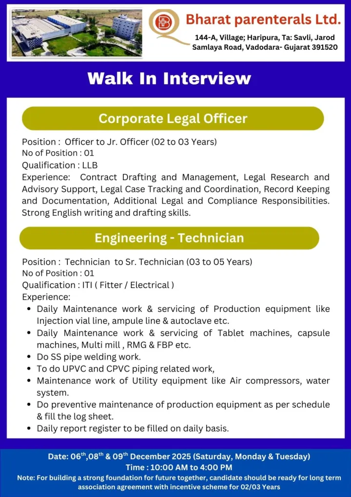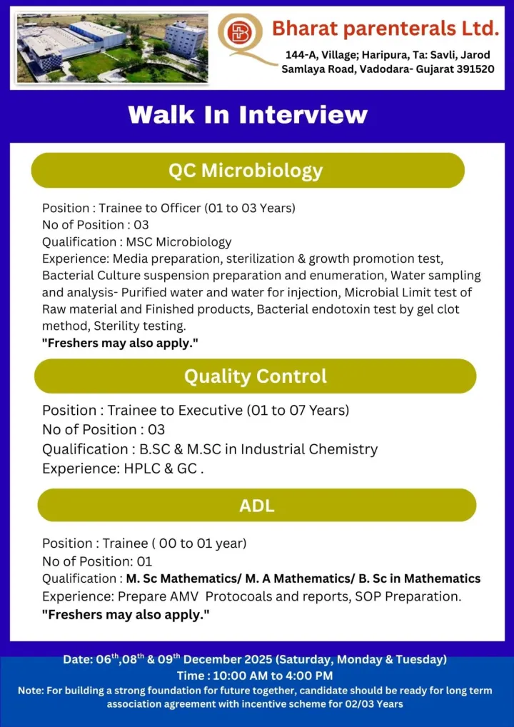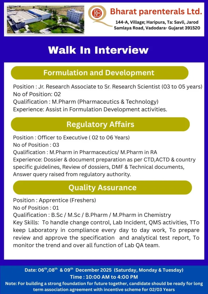 Bharat Parenterals Limited, a reputed and fast-growing pharmaceutical company, is inviting skilled and passionate professionals to join its dynamic team. This walk-in drive is an excellent opportunity for candidates seeking career growth in a stable and progressive pharma environment. Eligible candidates can attend the interview on the scheduled dates with the required documents.