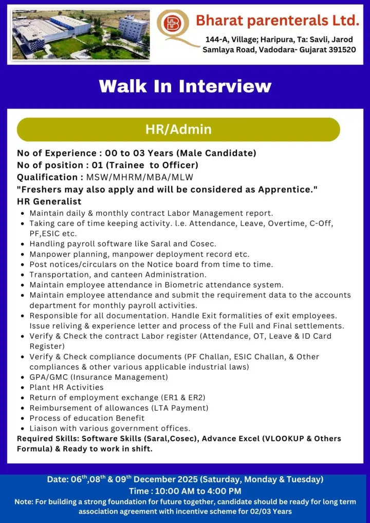 We are pleased to announce that Bharat Parenterals Ltd has arranged walk-in interview for potential pharma candidates. “Exciting Opportunity! Join us for a Walk-In Interview for multiple positions at a leading Pharma Company. Bring your expertise and passion for excellence to our dynamic team.