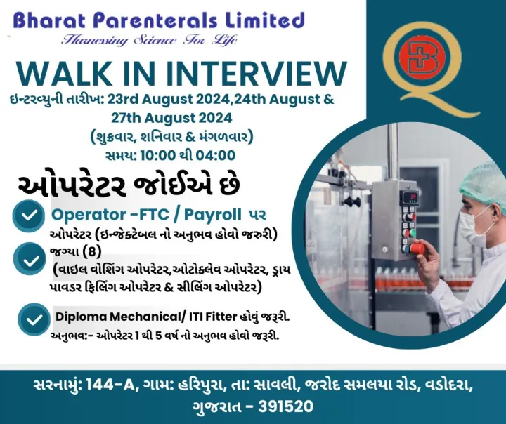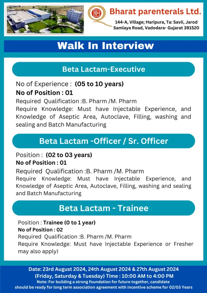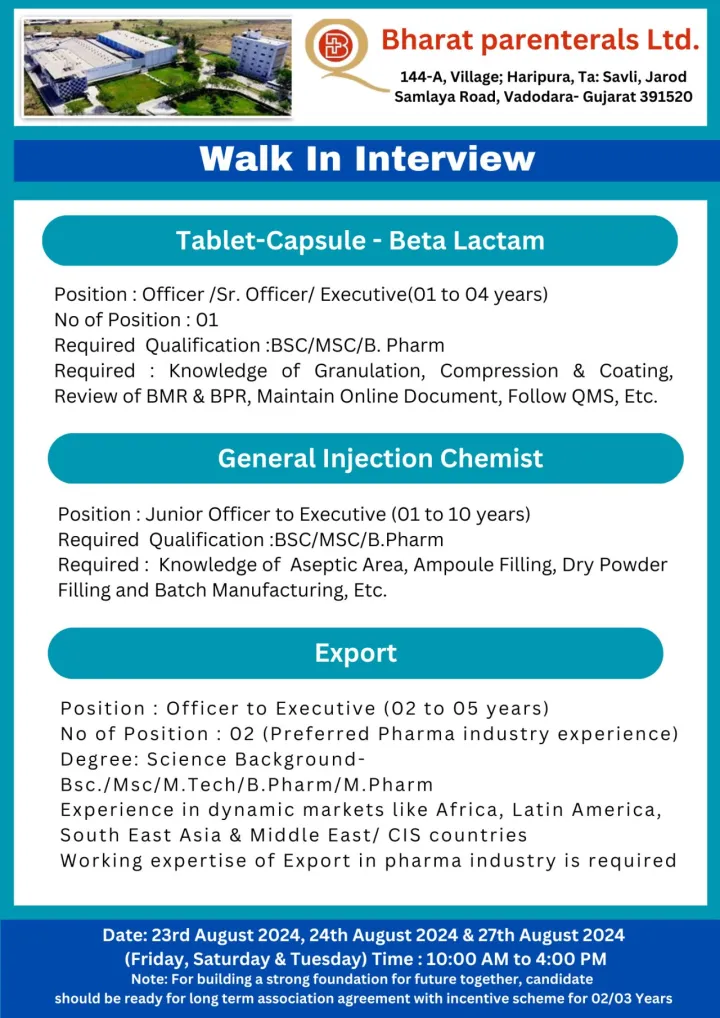 • Venue: Bharat Parenterals Ltd., 144-A, Village; Haripura, Ta: Savli, Jarod Samlaya Road, Vadodara- Gujarat 391520.