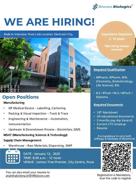 - You can also email your resume to ananthakrishna.b101@biocon.com