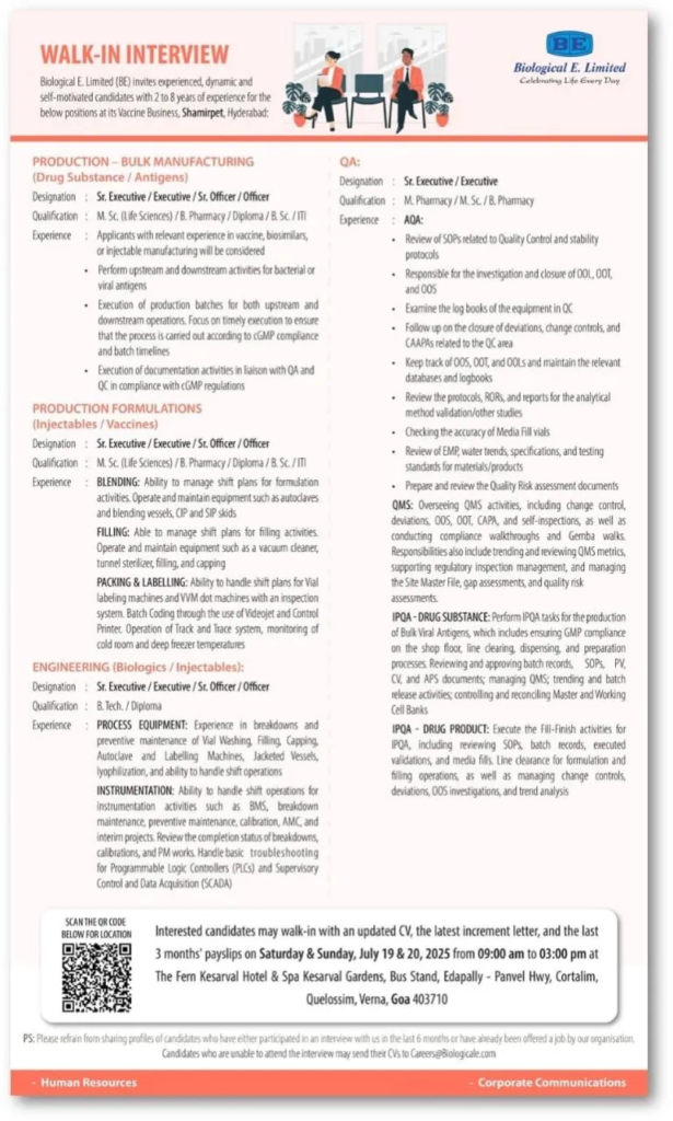 - Qualification : ITI / Diploma / B. Sc. / M.Sc / B.Pharm